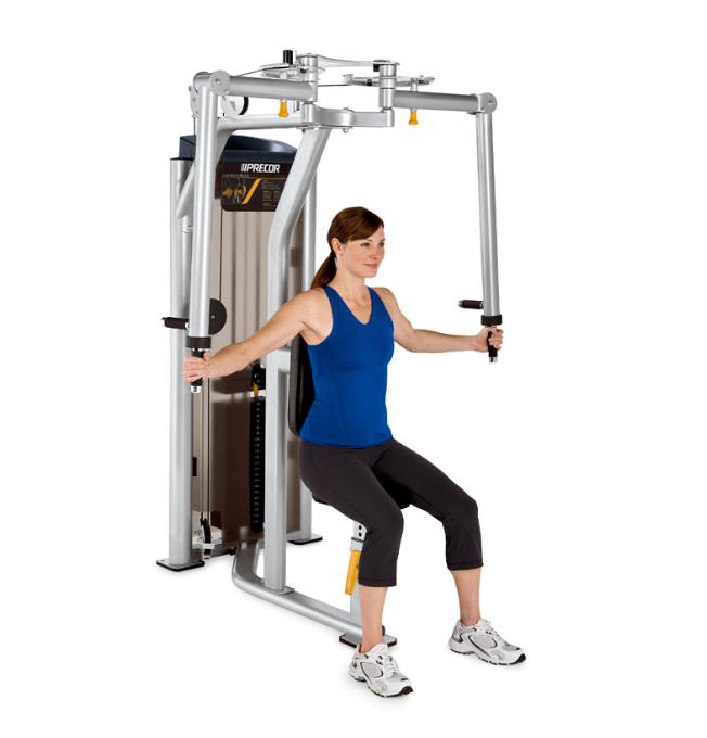 想增加肌肉塊,杠鈴練習是最重要、最基本的練習。建議初學者將杠鈴練習放到第一步,因為杠鈴練習的動作幅度相對較小,所以必須從不同的角度(上斜和下斜)、使用不同的握距刺激整個胸部肌肉。相對簡單安全的練習方法是平板杠鈴臥推,能有效鍛煉整個胸部、增加厚度。先平躺在臥推凳上,雙腳自然地放在地上,然后調(diào)整身體的前后位置,使眼睛位于臥推架上杠鈴的正下方。握距比肩稍寬,從臥推架上取下杠鈴,慢速下放杠鈴,直到上臂與地面平行為止。如此重復練習三四組,每組大概12-15次歐推動作,具體視個人身體條件。熟練之后,可以做下斜杠鈴臥推,重點鍛煉下胸部肌肉,操作難度稍微加強。 蝴蝶機———胸肌分離度